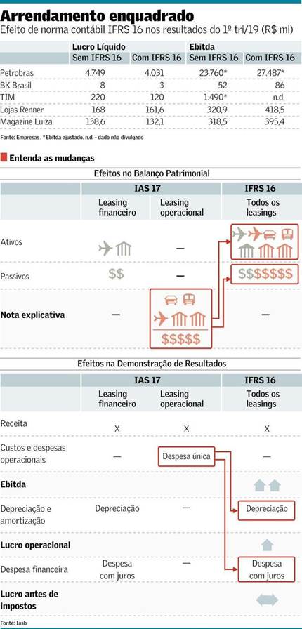A nova norma também teve efeitos no resultado operacional, segundo o jornal. O IFRS 16 prevê que o gasto com arrendamento deixe de ser registrado como custo ou despesa operacional e passe a ser repartido entre depreciação e despesa financeira. Com isso, o lucro cresceu 9,4%, para R$ 47,6 bilhões.